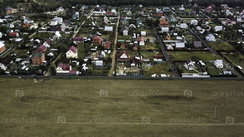 Вид с воздуха на красивые небольшие коттеджи, расположенные вблизи леса и зеленого поля, концепция экологии.Он летает над деревней летом