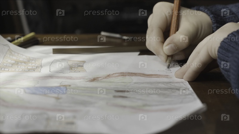 Рука ребенка с цветными карандашами закрывается.Рука ребенка рисует цветными карандашами.Копирование пространства белой бумаги.селективная ориентация.Руки ребенка нарисованы цветными карандашами.Закрой его