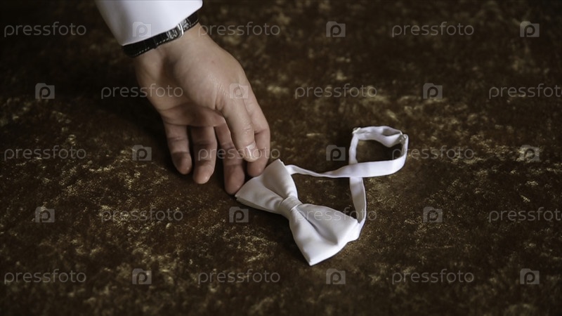Рука жениха берет галстук. Готовится к свадьбе. Мужчина берёт галстук. Свадебные аксессуары. Жених держит в руке коричневый галстук. Мужчина держит галстук. Элегантный джентльмен, одежда. Свадьба