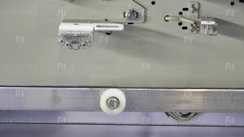 Вид внутрь механизма лифта с помощью движущегося растянутого металлического кабеля СМИ Концепция технологии для повседневной городской жизни, подъемная система в действии