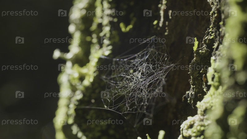 Большая паутина, на дереве, на утренней росе, на естественном фоне, очень сильная паутина