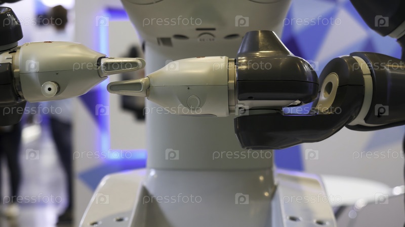 Высокотехнологичный, автоматизированный робот, движущиеся руки на ЭКСПО, выставка с достижениями народов.СМИ. Закройте свои руки перед современными роботами в движении