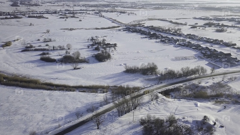 Вид воздушного беспилотника в холодную зиму на снежно-белых полях и лесах