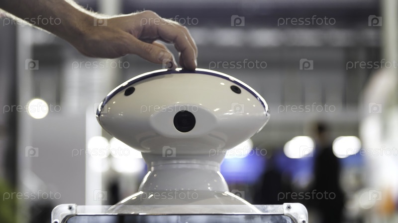 Закройте руку человека, касающегося головы робота на выставке СМИ Человек гладит голову движущегося гуманоидального пластмассового робота, концепция современных технологий