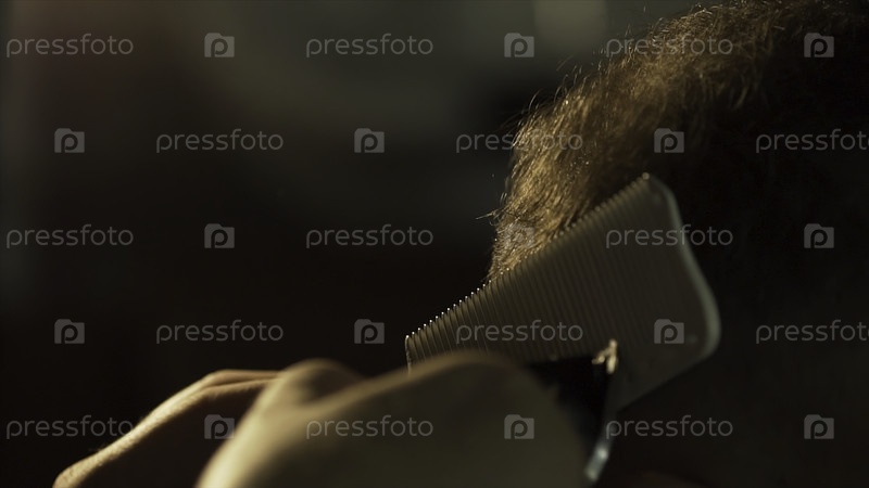 Мужчина сделал крутую стрижку у парикмахера. Рамка. Руки профессионального фризерского стилиста срезали волосы клиента. Покрыть руку косметолога ножницами. Выборочный трюк. Барбер делает резку мужчиной с помощью электрической бритвы. Уход за мужской голов