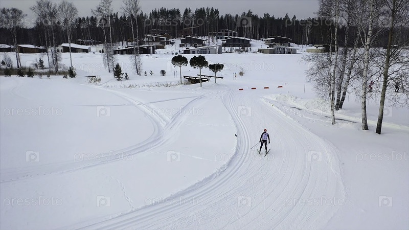 Спортсмены по горнолыжному спорту зимой. Кадр. Вид на тренировку профессиональных лыжников на лыжной трассе в зимний период