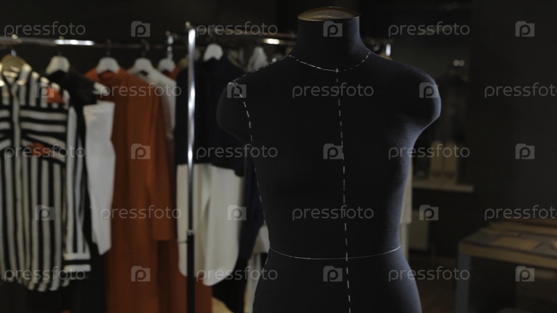 Пустой черный манекен на заднем плане находится посередине студии. Прекрасная игрушка в виде платьев, висящих на веревке. Магазин 'Dummi'. Дизайнер моды Draping Dummy in Studio Mannequin или Dressmakers Dummy On с торговым центром на фоне