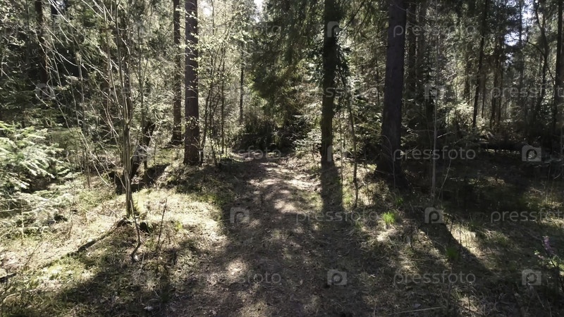 одиночная прогулка по лесной тропе в солнечный день. вид от первого лица прогулки по извилистой лесной дорожке летом. одинокая прогулка через сосновый лес в солнечный летний день