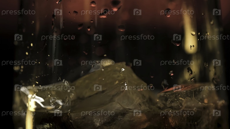 Заливание свежего алкогольного напитка в стакан с кубиками льда на темном фоне с красным тусклым светом.Завершите процесс коктейля, добавив напиток в стакан