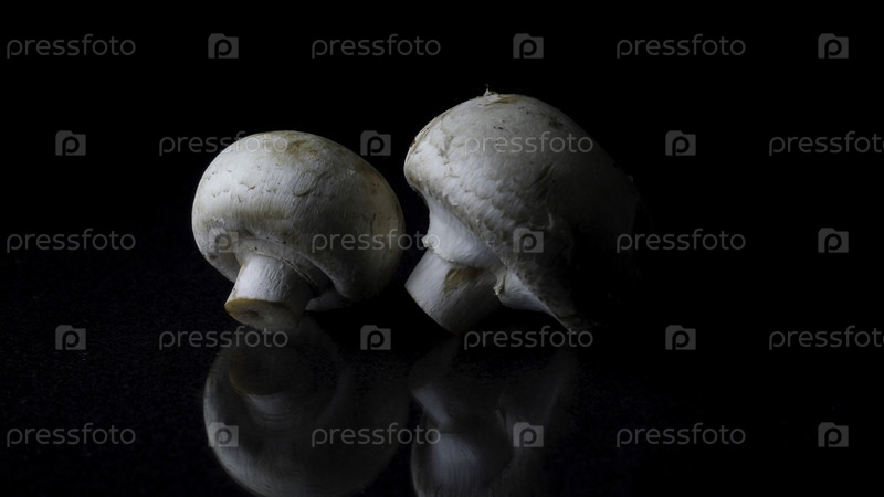 Грибы на черном фоне. Рамка. Два гриба, выделенные на чёрном отражающем фоне