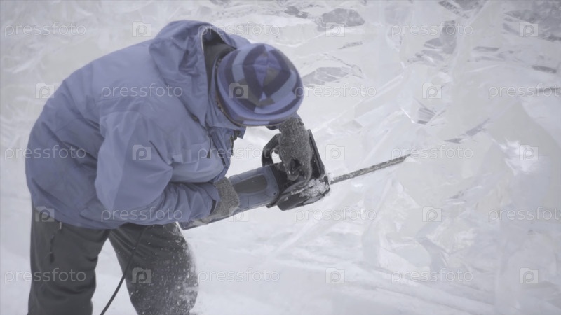 Вид скульптора, вырезающего лед. Движение. Резать лёд бензопилой. Вырезать и сделать снежную скульптуру. Молить ледяную воду топором. Ледная скульптура. V-LOG