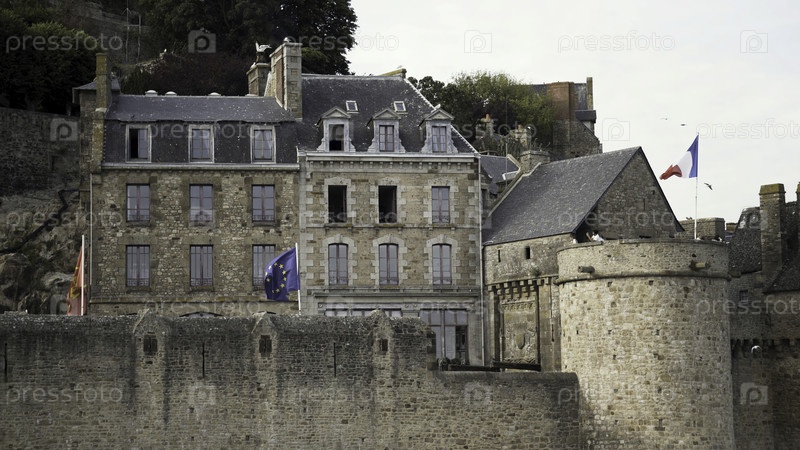 Удивительный старый кирпичный дом на скале окружен высокой стеной и башней с туристами, архитектурная концепция.Древнее каменное здание со флагами Франции, Европейского Союза и Нормандии