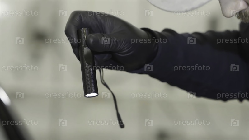 Ближе к человеческой руке в черной перчатке, держа чёрный фонарик с узким лучом в мастерской.Человек держит маленький фонарик во время процесса работы