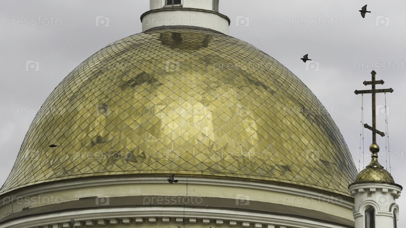Птицы летают рядом с красивой церковью, концепция религии. ортодоксальные золотые кресты и купола на церкви среди облаков