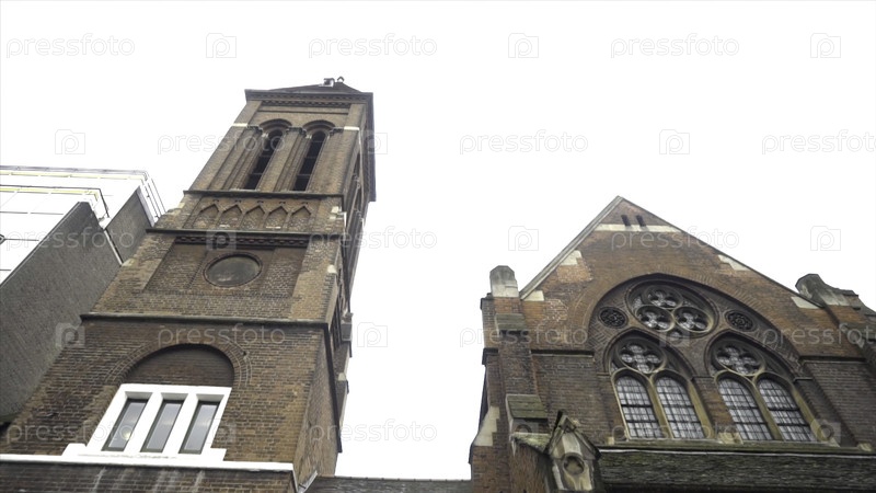 Нижний вид старого архитектурного здания города на облачном небе. Продолжайте. Фасад старой готической церкви из темных кирпичей с башней в городе