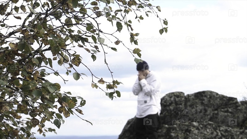 Человеческий пешеход стоит возле валуна, прикасаясь к лицу за ветвью дерева. Видеозапись. Желто-зеленые листья дерева летают на ветре с человеком, стоящим позади на обрыве