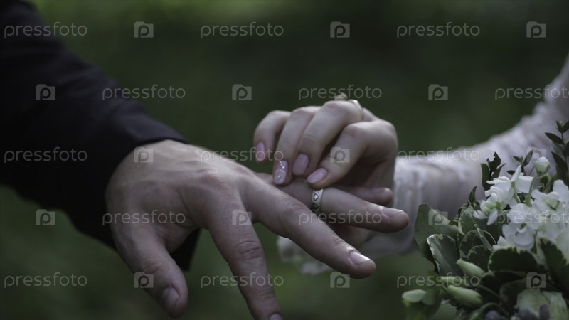 Невеста носит кольцо на пальце жениха.Жених надевает обручальное кольцо на палец невесты.Свадебные руки с кольцами.Птица носит кольцо на пальце жениха