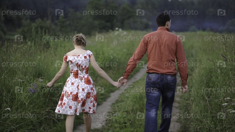 Влюбленная пара держится за руки в лесу.Клип.Разгляд сзади пары, гуляющей по лесу, держась за руки