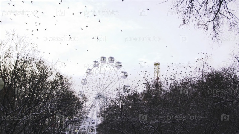 Неподвижное колесо обозрения в парке развлечений на фоне серого неба.Сток.Красивое стадо птиц улетает из парка развлечений осенью без людей