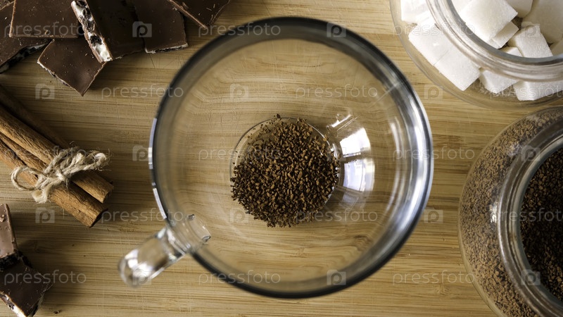 Положение кофе, кубика сахара и горячей воды в прозрачную кружку на деревянном столе среди шоколада и корицы