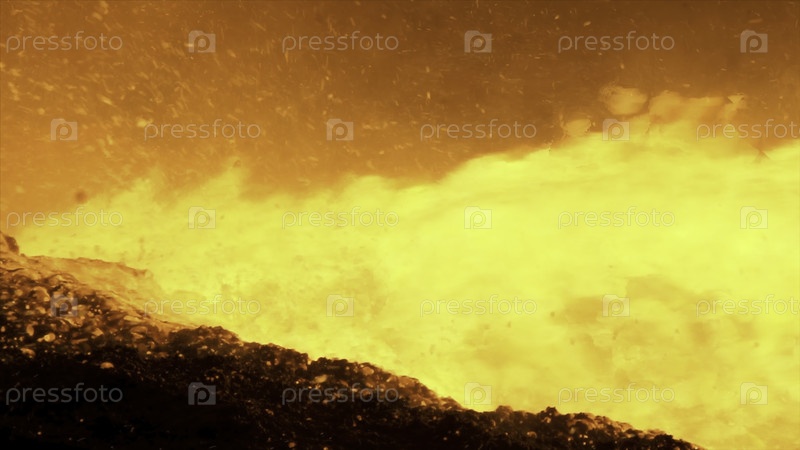 Близко к жидкому металлу, протекающему из высокой печи на металлургическом заводе, концепция тяжелой промышленности. литье расплавленной стали из трубы со многими искрами, летящими в стороны