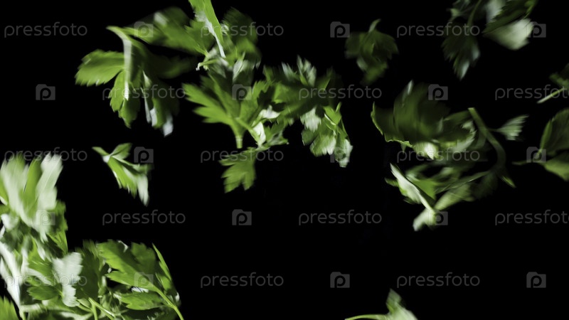 Листья петрушки падают на черный фон. Рамка. Петрушка колеблется в рамке. Листья петрушки медленно выпадают на поверхность