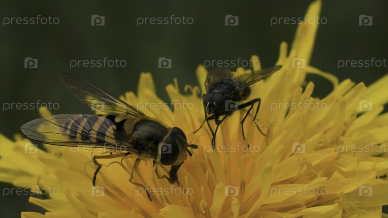 Пчелы опыляют желтый цветок одуванчика на размытом фоне зеленой травы.Движение.Маленькие насекомые едят нектар яркого летнего цвета