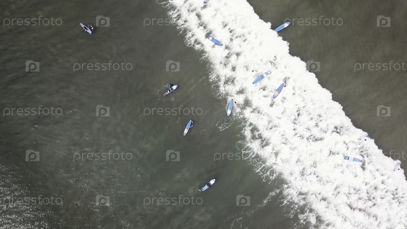 Вид с воздуха серферов, ожидающих волн в океане в ясный день.Вид из воздуха серфера на огромной волне Индийского океана.Серферы на пляже вид сверху