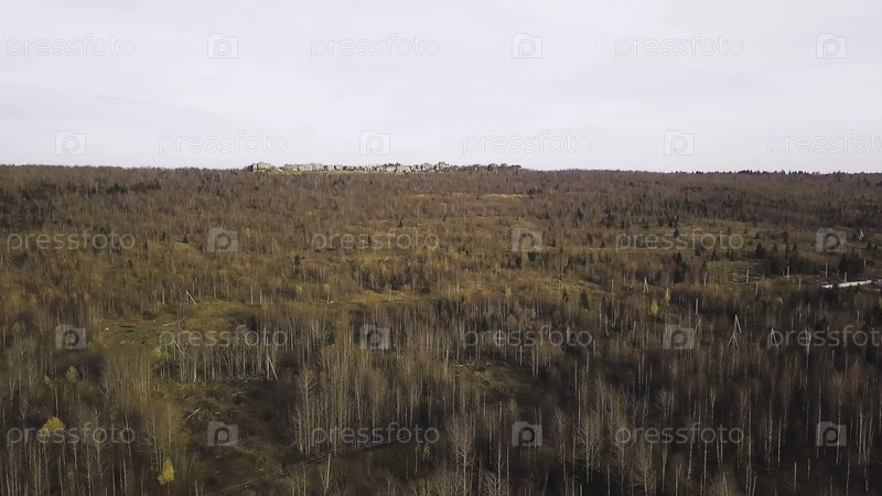 Панорама осеннего голого леса с камнями. Клип. Вид на лесистые осенние холмы с камнями разрушенных гор. Красивые осенние пейзажи с деревьями и скалами