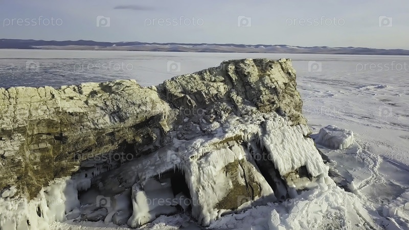 Вид с воздуха на огромное замерзшее озеро, покрытое снегом со скалой, поднимающейся сквозь лед.Зимний пейзаж природного водоема и каменистого холма