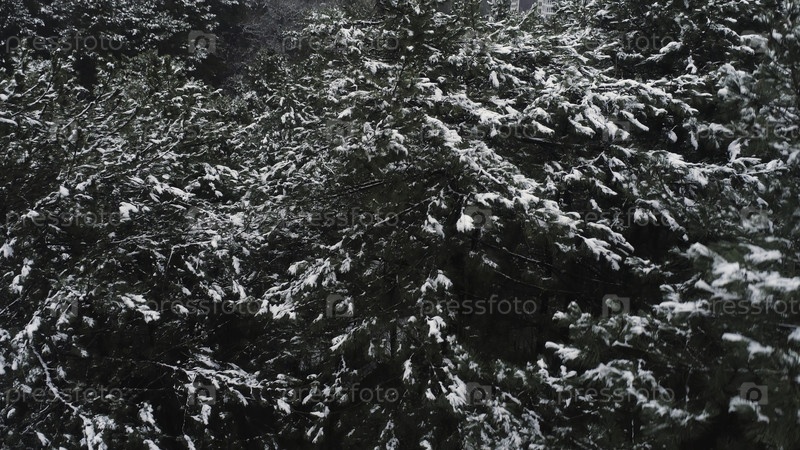 В воздухе заснеженные еловые деревья в живописной канадской пустыне.Впечатляющий вид на бесконечный сосновый лес, покрытый снегом в зимний день