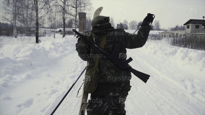 Группа солдат, катающихся на лыжах в лесу с оружием. Солдаты с автоматами АК-47 и гранатометами бегают по зимнему лесу на лыжах. Солдаты тренируются в лесу зимой. Зимняя война и военная концепция