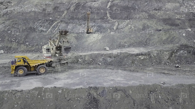 Экскаватор и буровой грузовик при погрузке каменной руды в серый карьер, горнодобывающая промышленность