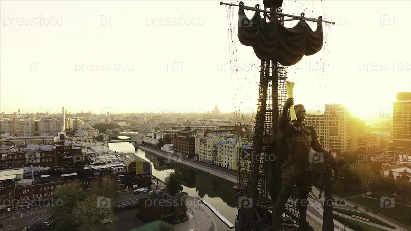 Фрагмент памятника императору Петру Великому на большом городе и яркий фон захода солнца
