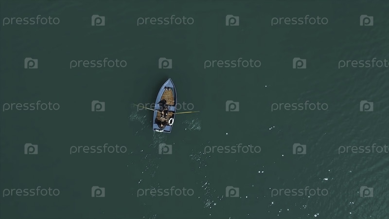 Лодка на озере. Вид с воздуха двух мужчин в лодке на озере, гребят к берегу. Одинокая лодка посреди реки, озера. Лодка одного ряда на море с отражением в воде при утреннем свете