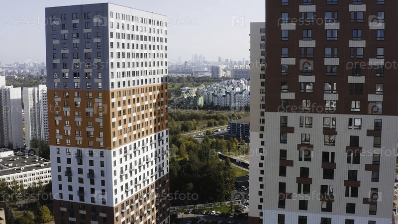 Вид на многоцветные жилые комплексы в городе. Идите дальше. Красивая панорама города открывается с верхних этажей современного жилого комплекса. Яркий жилой комплекс в солнечный день