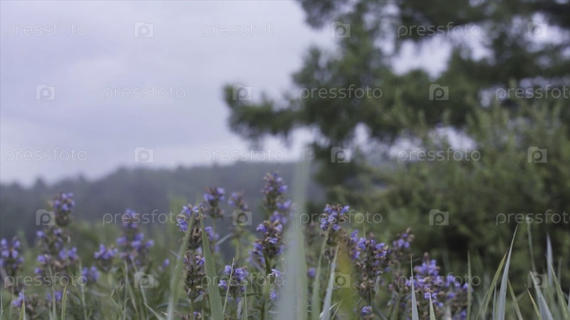 Естественный летний пейзаж зеленого поля с фиолетовыми цветами на голубом облачном небе и зелёном фоне деревьев. резервные кадры. Мягкие лиловые цветы раскачиваются в ветре