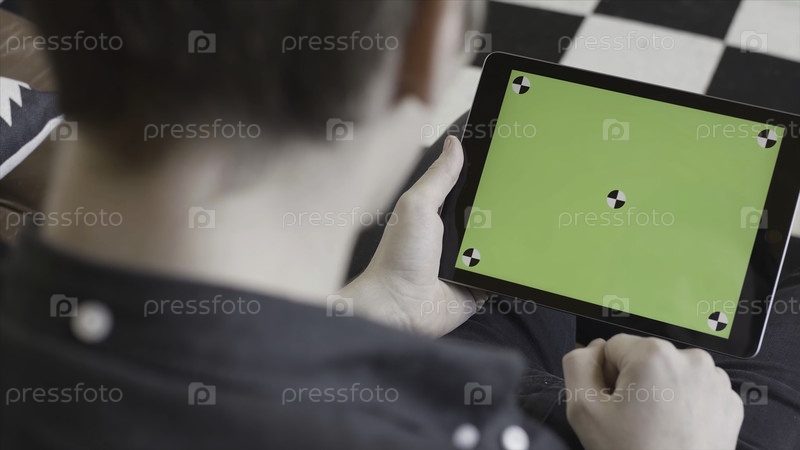 Технология и концепция Интернета, над плечом вид человека, нажимающего на зеленый экран планшета с отслеживающими знаками. резервные записи. Закрытый мужчина в черной рубашке использует свое хромированное ключевое устройство