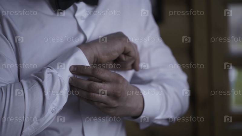 Мужчина застегнул рукава своей рубашки. Закройте руку человека, который носит белую рубашку и манжетовую пуговицу
