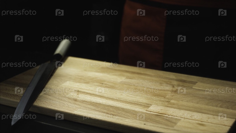 Закрытие ножа на режущей доске. Деревянная доска и нож готовы к приготовлению пищи на темном фоне. Резание и кулинарные предметы