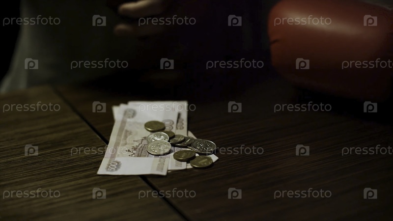 Закройте руки человека, держа открытый кожаный кошелек с несколькими монетами внутри над старым деревянным столом, на котором лежали бумажные деньги