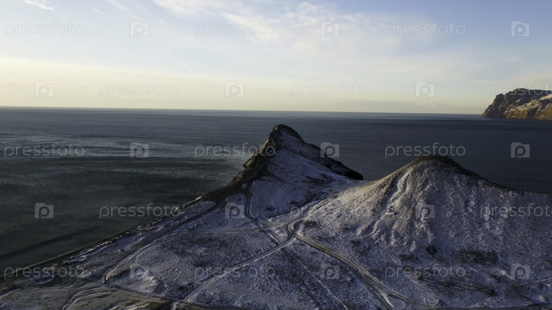 Вид с воздуха на краю горного побережья в Гренландии.Вид с воздуха на заснеженные горы в Гренландии