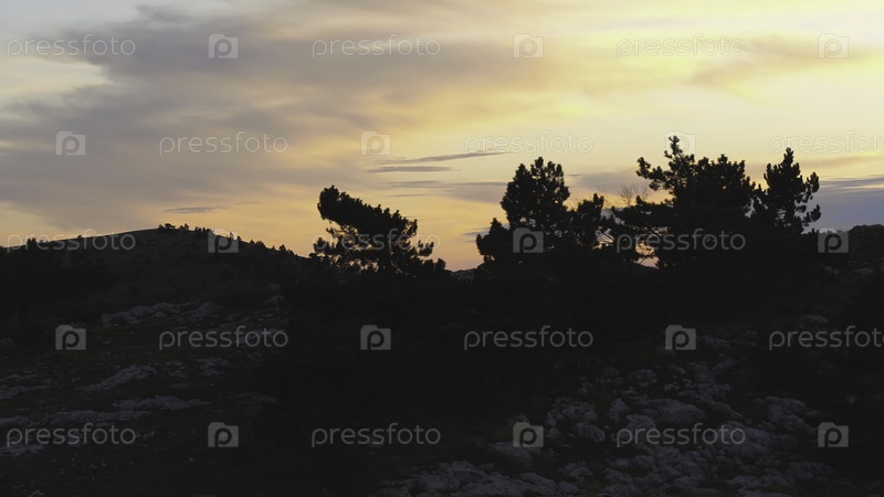 Вид сверху на скалистую вершину на фоне заката цветов с облаками. стрельба. красочный пейзаж неба при закате солнца с облаками