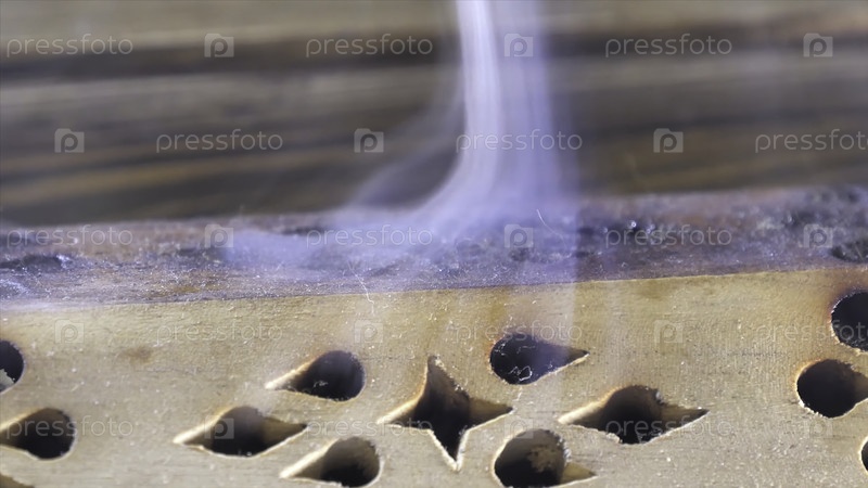 Красивый ароматный дым возле статуэтки.На деревянной чайной доске Чабан с ароматическим дымом.Макро закрывает горящие палочки дымом на коричневом фоне