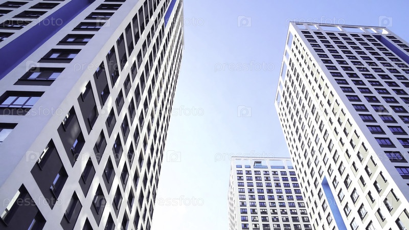 Нижний вид новых жилых многоэтажных зданий с голубым небом. Городская среда. Рамка. Новейшие жилые комплексы с экологически чистой средой