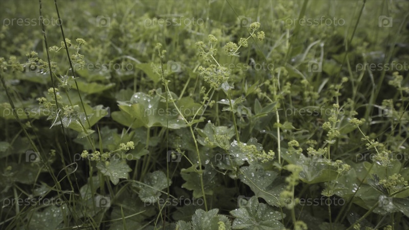 Ближайшие дикие зеленые растения, растущие на поле с красивыми маленькими каплями влаги, утренняя природа. резервные кадры. Зеленый свежий луг с кристаллами росы