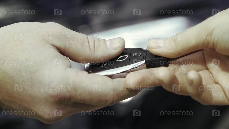 - Берлин, Германия, 12 сентября 2018: Автобизнес, продажи автомобилей, сделки, жесты и концепции людей - закрытие дилера с передачей ключа новому владельцу и рукопожатия в автосалоне