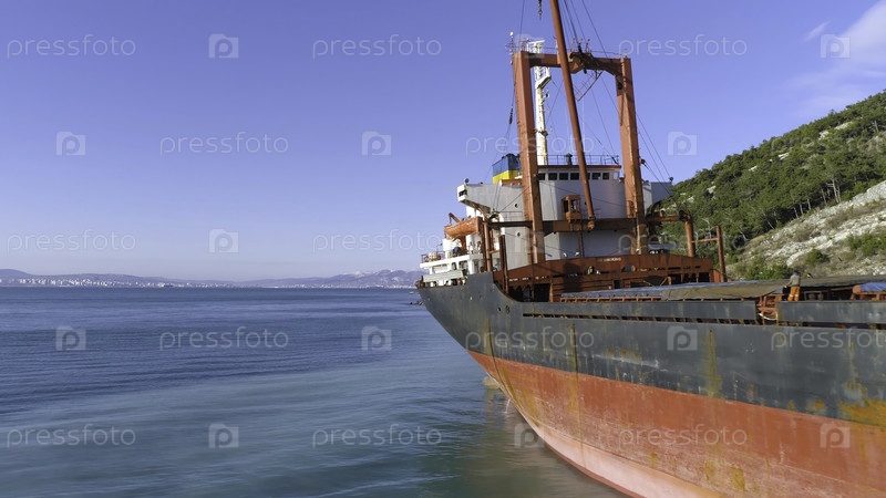 Воздух для красной пустой баржи, пришвартованной вдоль берега моря возле склона, покрытого зелеными деревьями на фоне голубого неба