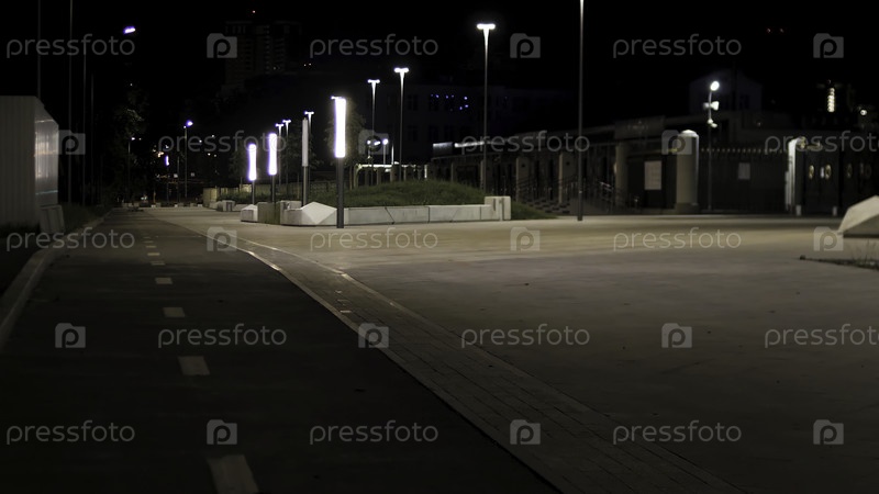 Прогулка по городскому парку ночью с уличными огнями. поздно вечером переулок в парке со светофорами и зеленой лужайкой, романтическая атмосфера