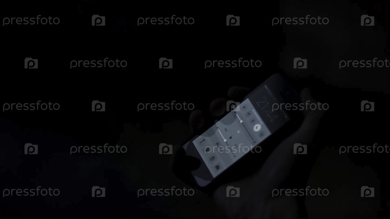 Закройте руку с помощью мобильного телефона, чтобы включить ее ночью в темной комнате.Рука держит смартфон, включает ночной режим